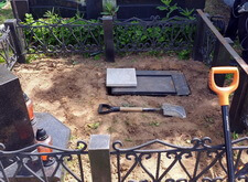Глубина ямы точно соответствовала высоте нового саркофага, а потому наземное покрытие, которое мы положим в дальнейшем, будет смотреться ровно и без ощутимых перепадов.